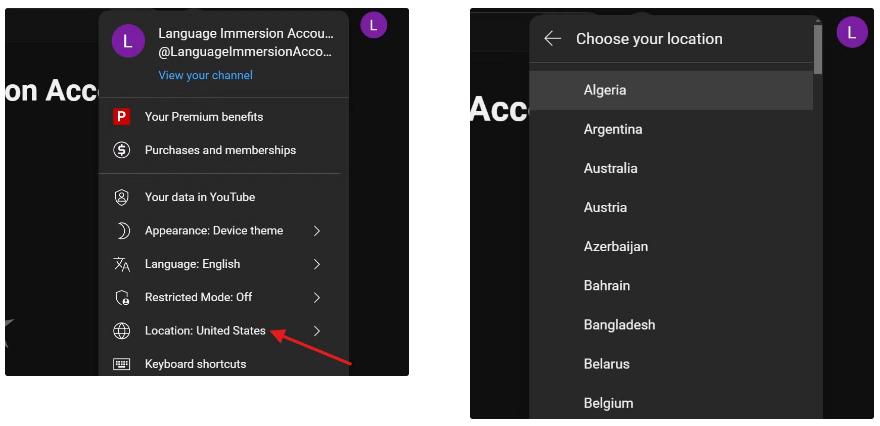 1. Change the location of the account. Click on your profile icon, select “location,” and choose a country that speaks your target language from the dropdown list.