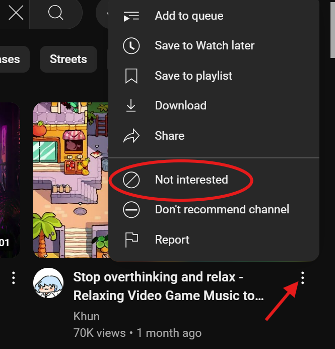 Now everything should be in the language you’re learning! If a video in your native language sneaks into your recommendations, you can tell YouTube that you’re not interested in it by hovering over the video in your feed, clicking the three little dots, and selecting “Not Interested.”